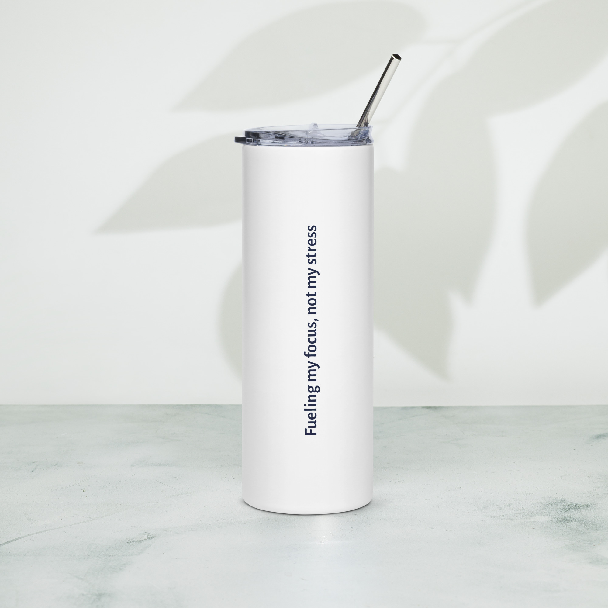 Enjoy hot or cold drinks on the go with this stylish stainless steel tumbler! This reusable tumbler with a metal straw is a perfect combo for hot or cold drinks at any time of the day, and it carries an important reminder: “Fueling my focus, not my stress”.